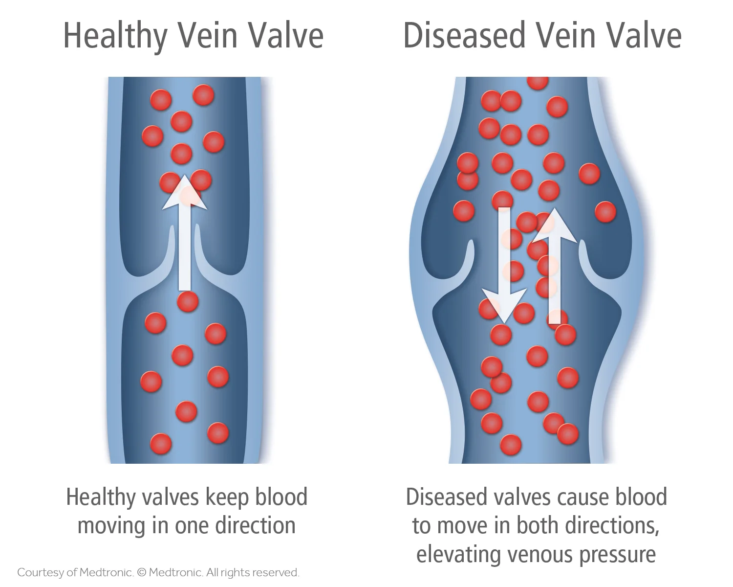 Varicose veins and spider veins are caused by damaged valves in your veins that allow blood to flow in the wrong direction, which leads to stretched out, bulging veins.