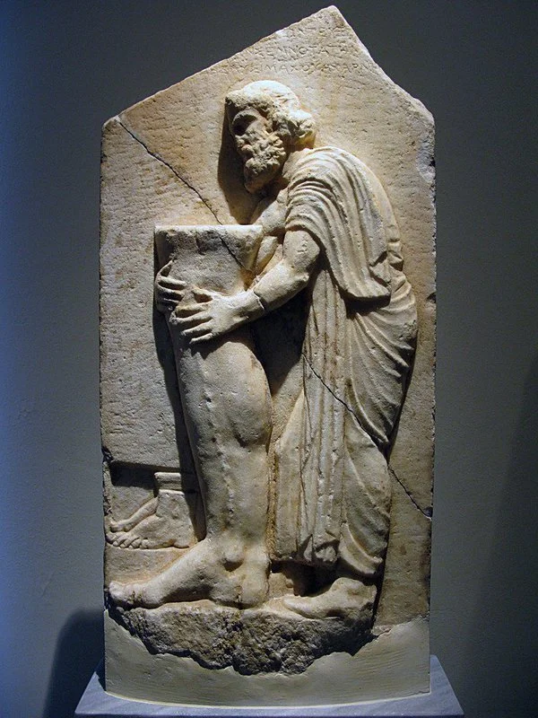 Varicose vein disease has plagued mankind for millennia. The stone tablet depicted here is a sculptural relief from the sanctuary of Amynos, who was the Athenian hero associated with healing. From circa 340 B.C., the image is the oldest known depiction of varicose veins. The carving shows the Greek official Lysimachides dedicating a fake leg suffering from a varicose vein to Amynos.